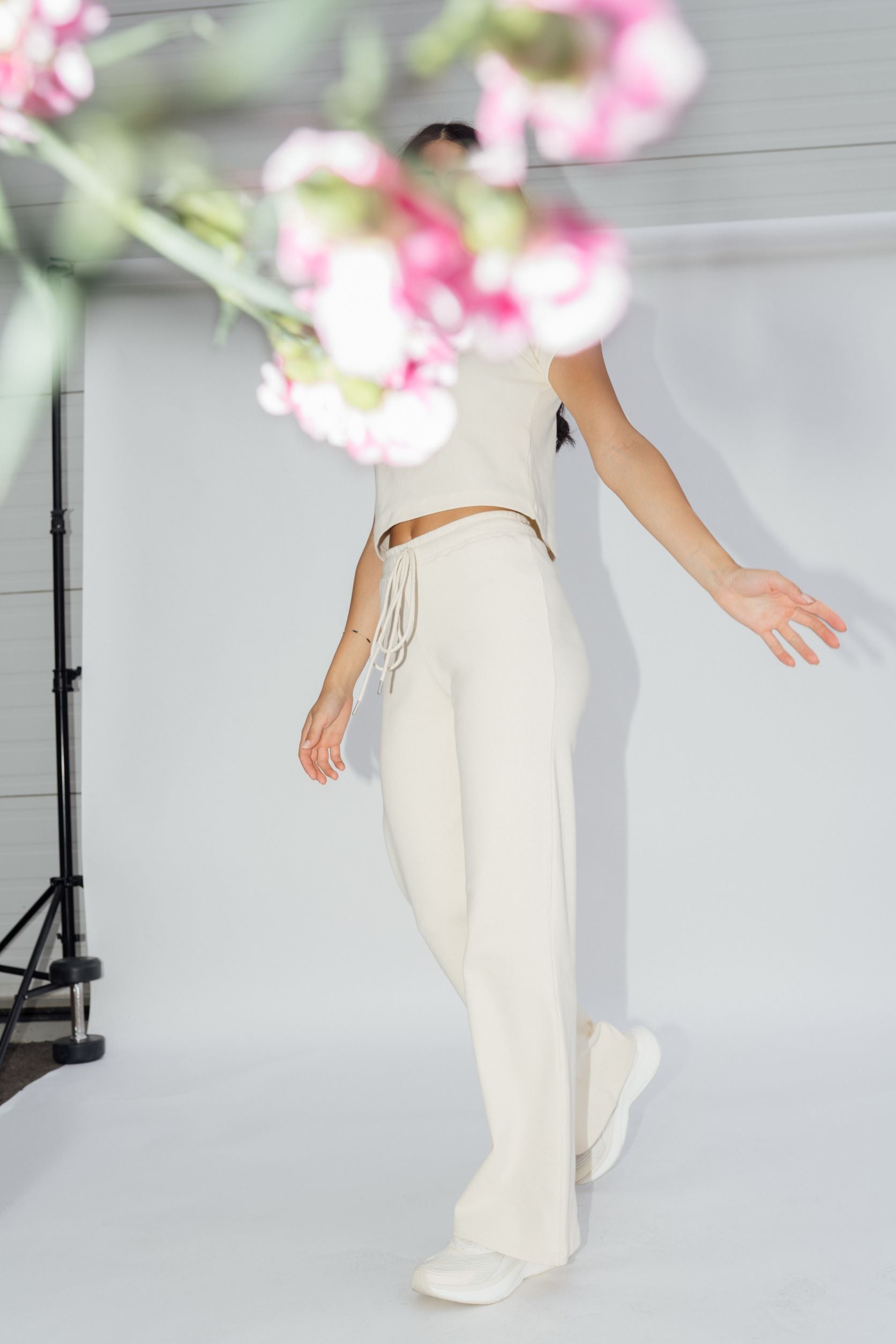 Our Wide Leg Lounge Pants in Cream are the quintessential loungewear staple. They feature a relaxed fit and cream rope drawstring. Made with super thick and stretchy ribbed organic cotton.