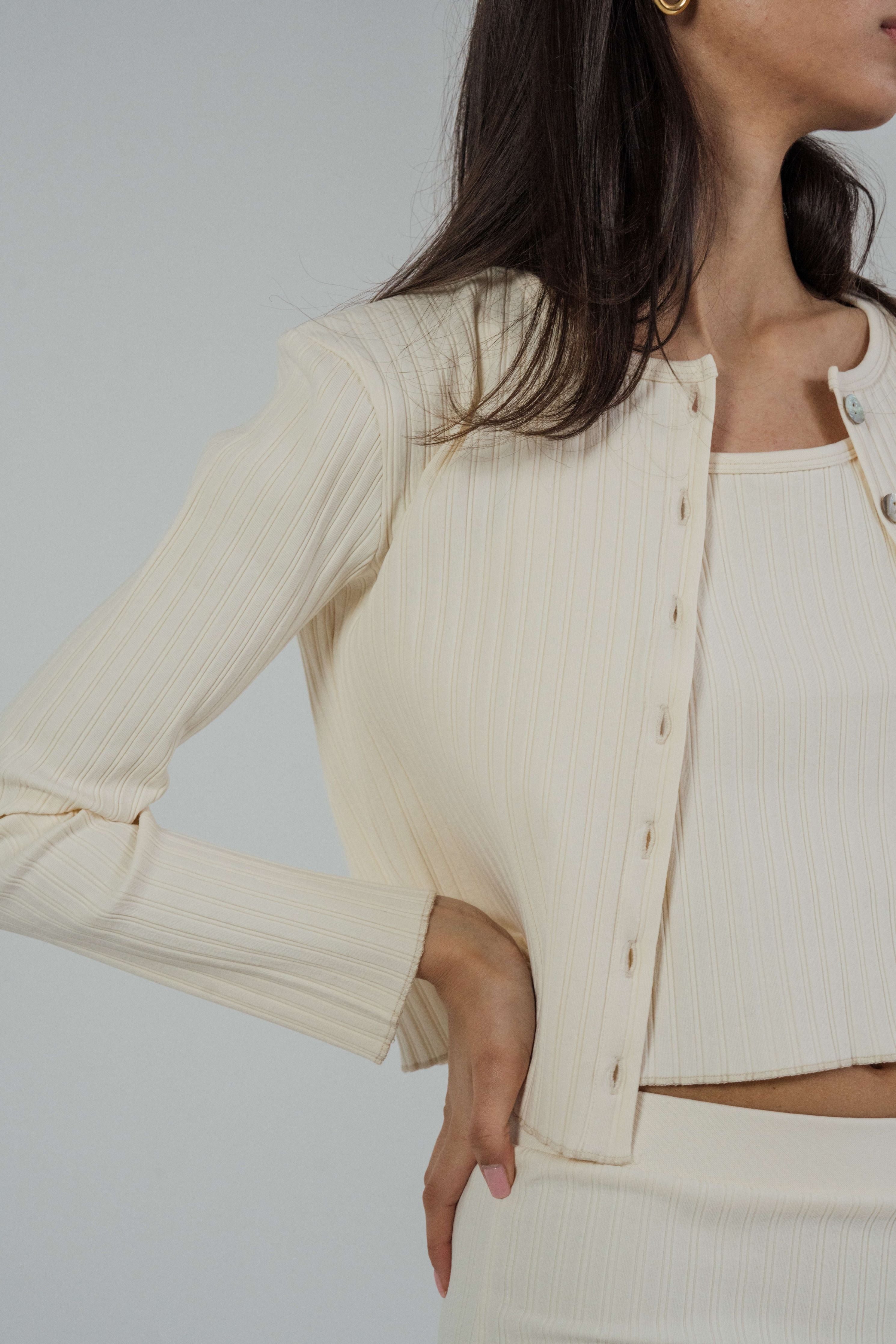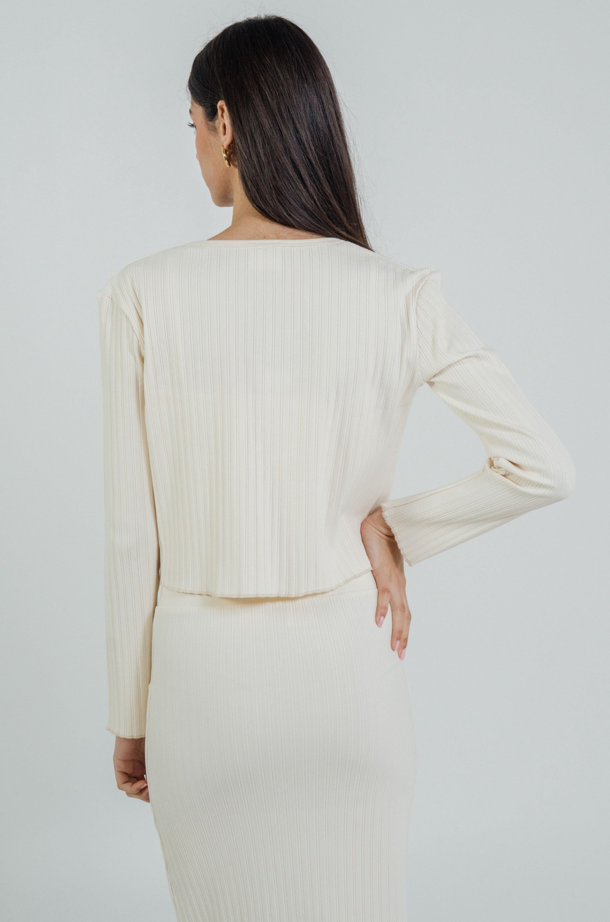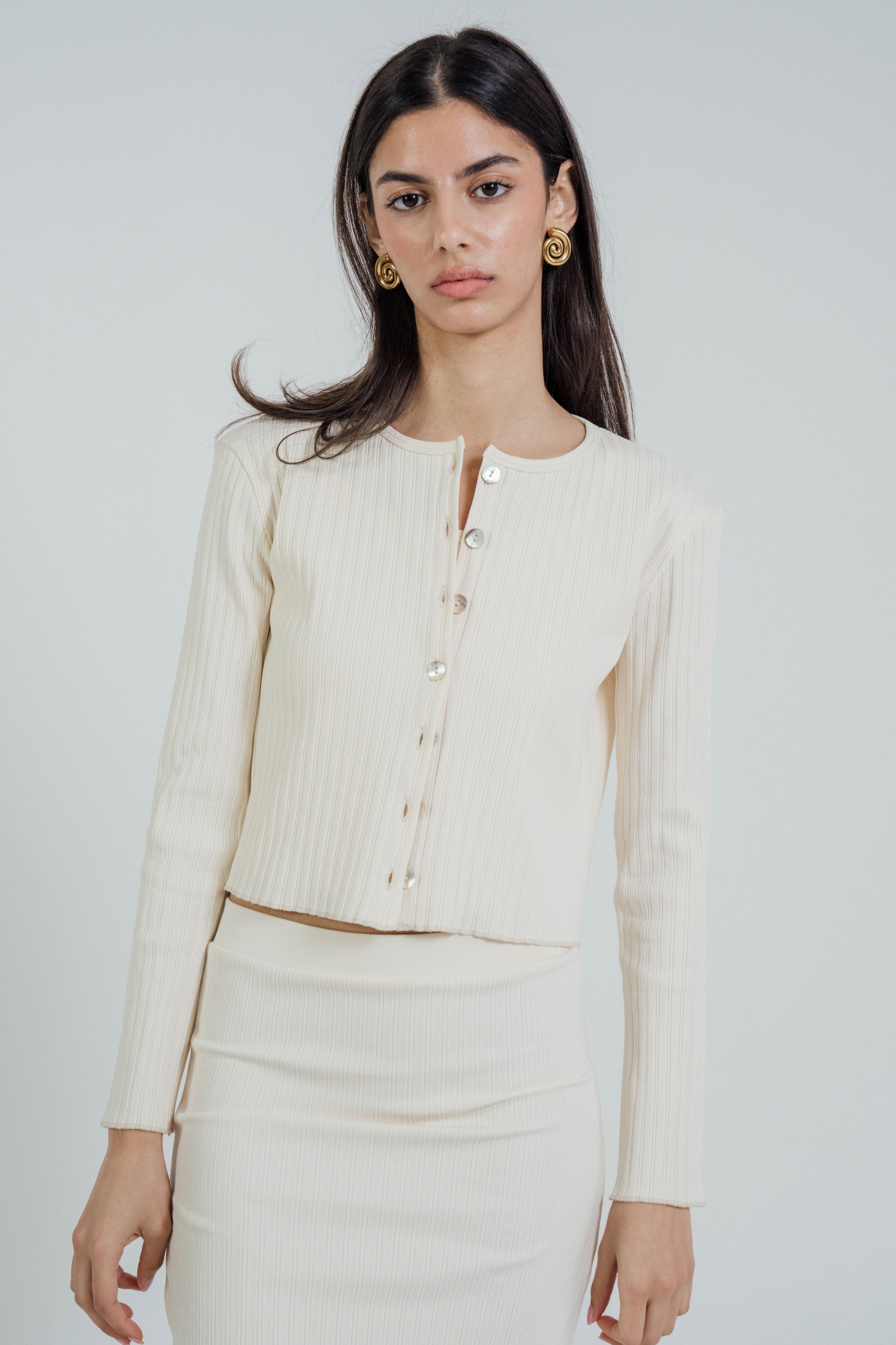 The Rib Knit Cardigan in Ivory, features a fitted bodice and sleeves, a high scoop neckline and mother of pearl buttons. Made with mid-weight ribbed organic cotton.