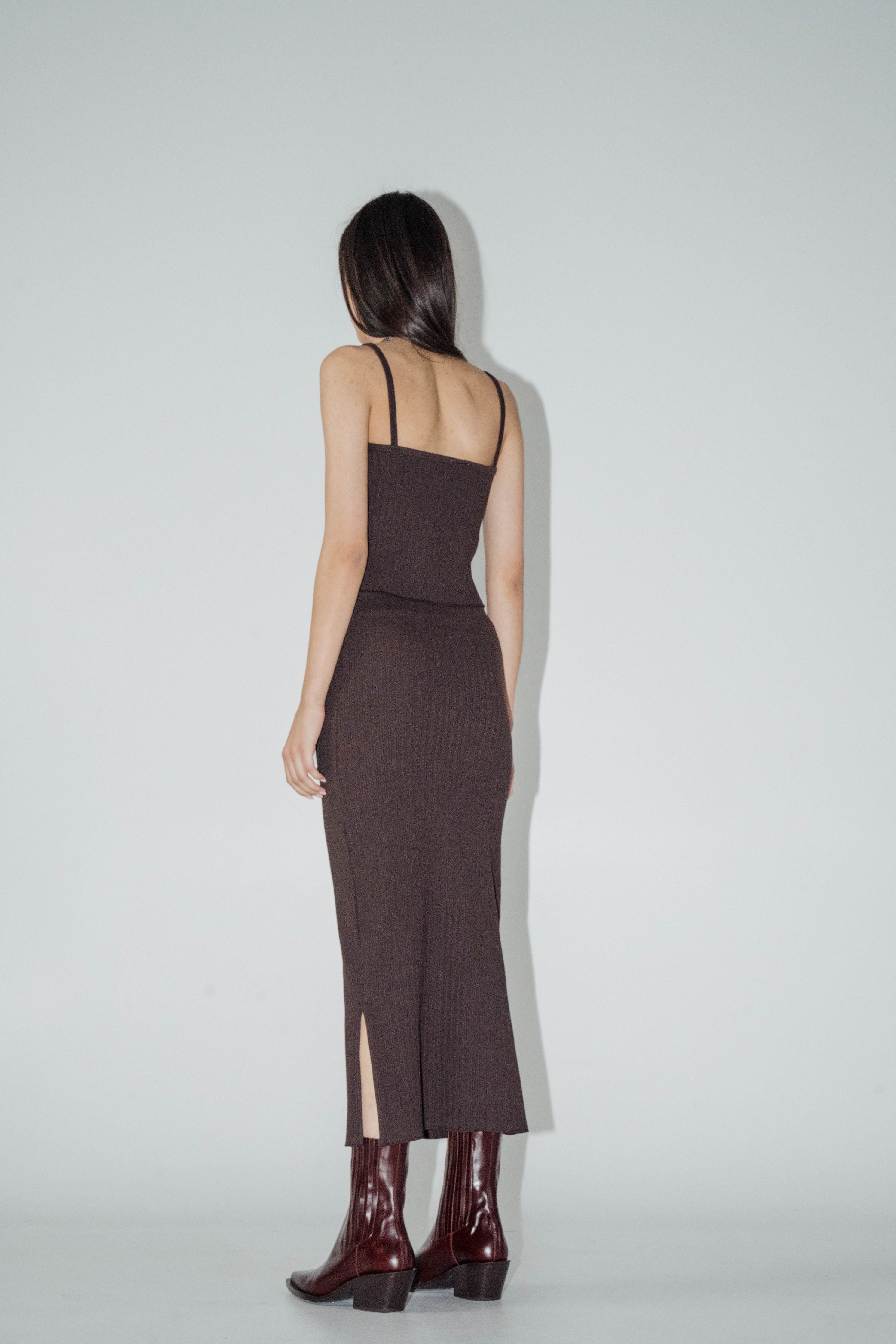 The Rib Knit Cami in Hickory, features a fitted bodice and scoop neckline. Made with mid-weight ribbed organic cotton.